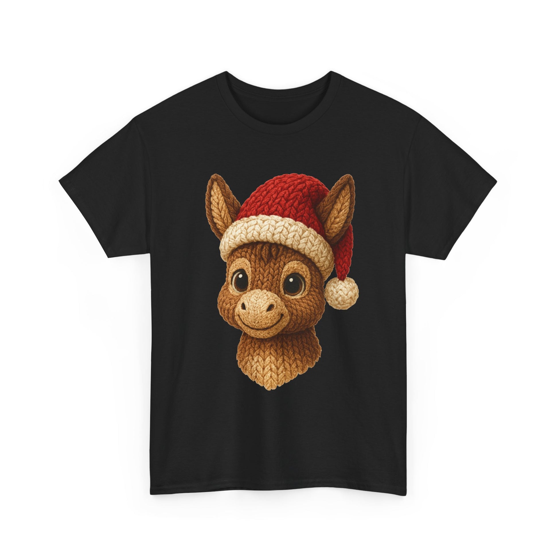 Soft, nostalgic, and gently whimsical — this classic cotton tee carries a hand-illustrated foal wearing a knitted Santa hat. The art feels like a cozy storybook: warm browns, expressive eyes, and a textured hat that suggests fireside evenings and holiday mischief. Lightweight but sturdy, the shirt drapes casually and keeps the print crisp so the little character stays the focal point, whether worn at a family gathering or while wrapping gifts. Wear it when you want to bring a quiet, heartwarming smile to a room — thoughtful, tender, and subtly festive.