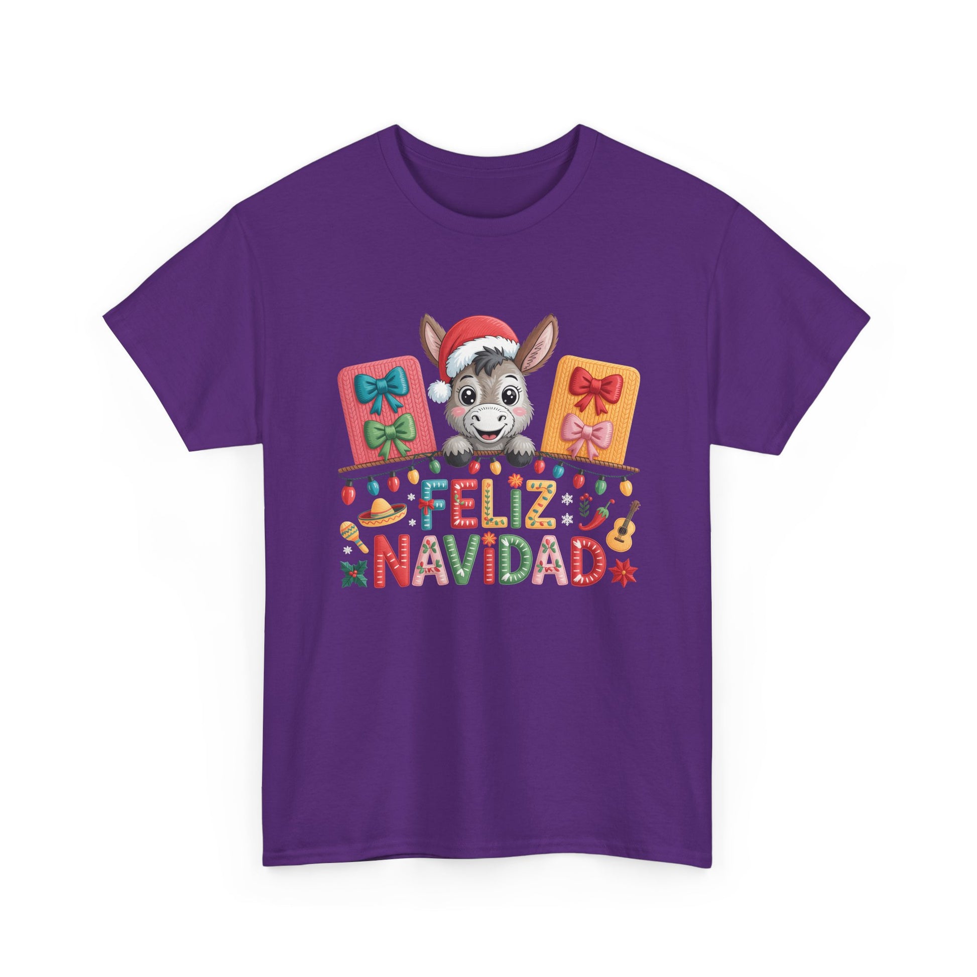 A soft, classic cotton tee that brings warm holiday cheer with a playful, hand-drawn illustration and the joyful message “Feliz Navidad.” The shirt shows a smiling donkey in a Santa hat peeking over colorful wrapped gifts, surrounded by tiny festive icons — candy canes, stars and string lights — in a bright, folk-inspired palette. Lightweight but durable, the fabric keeps prints vibrant and the crew neckline holds its shape. Wear it to casual family gatherings, neighborhood holiday parties, or while wrapping presents at home. This tee pairs effortlessly with jeans, cozy leggings, or a flannel for a relaxed, cheerful holiday look that feels both familiar and whimsical.